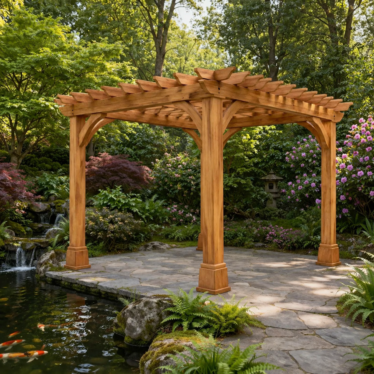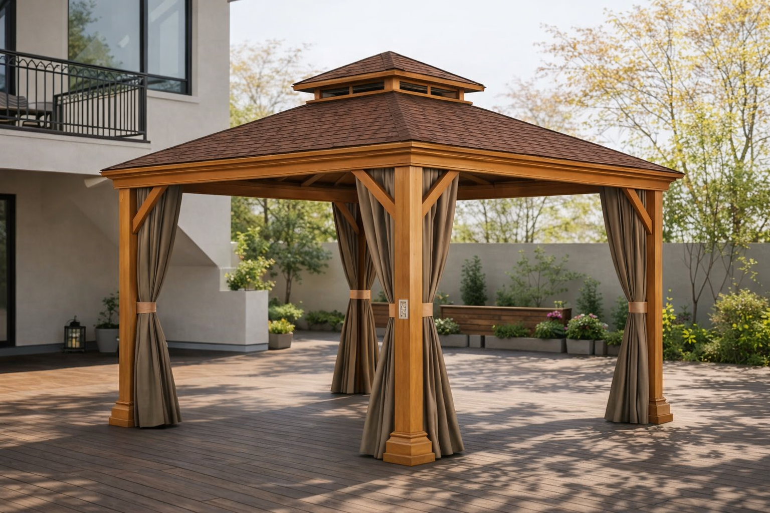 Dieser Pavillon bietet einen überdachten Bereich für den Aufenthalt im Außenbereich. Die Konstruktion umfasst ein Gestell mit Dach und teilweise offenen Seiten. Er eignet sich für den Einsatz im Garten, auf der Terrasse oder bei Veranstaltungen im Freien. Die Fläche kann zum Sitzen, Essen oder als geschützter Bereich genutzt werden.